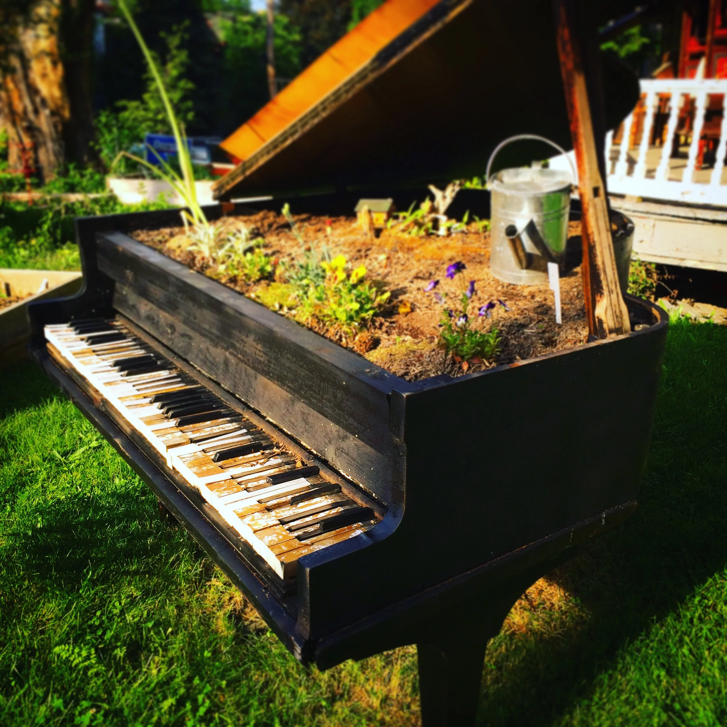 A recycled grand piano, repurposed into a flower garden. A great way to repurpose an unserviceable piano!