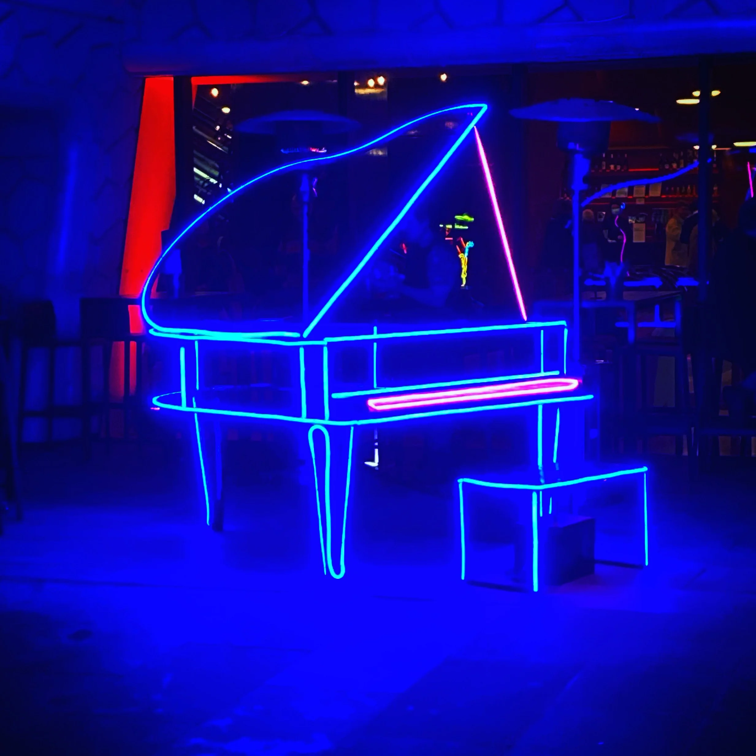 A grand piano installation made from neon lights outside the Melbourne Recital Centre