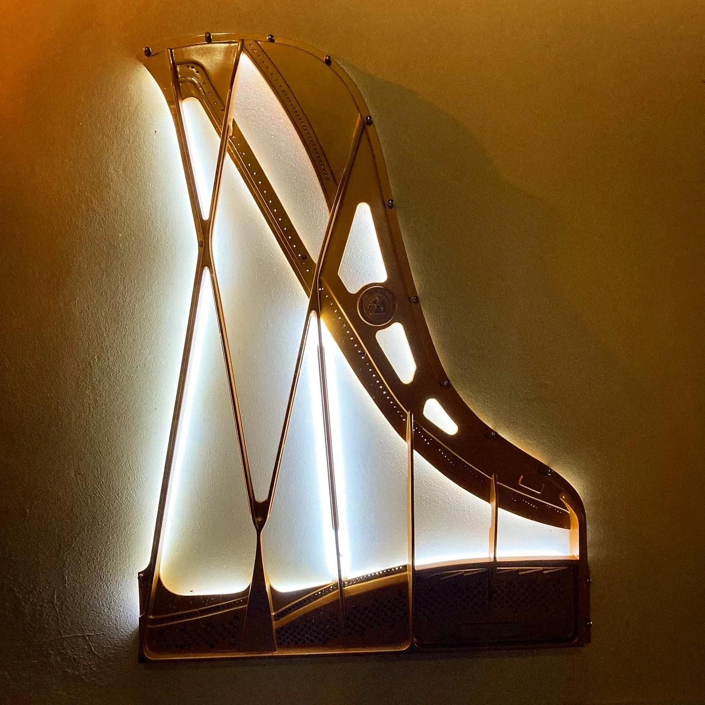 The iron frame of an upright piano, backlit, and hung on a wall at nighttime