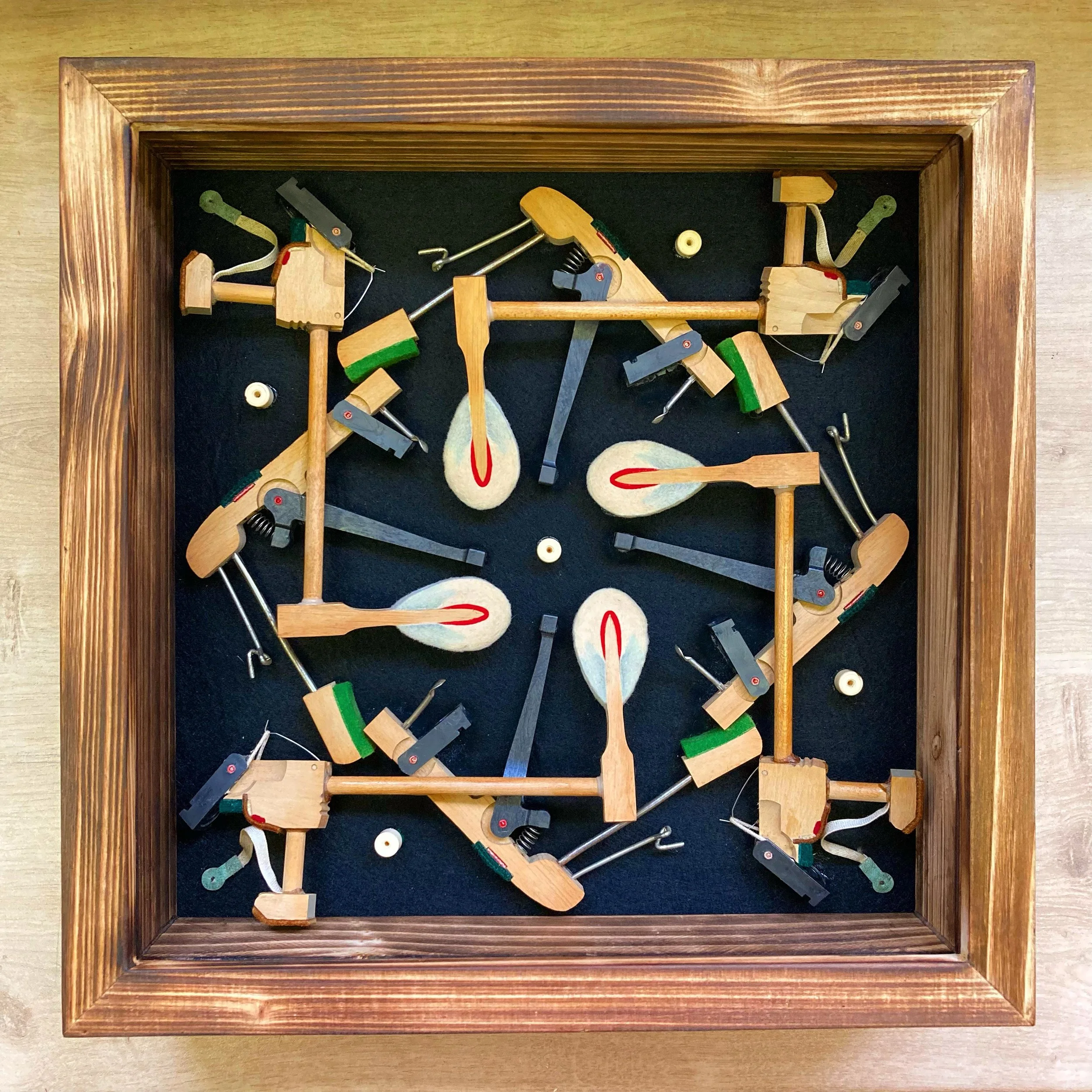 A deconstructed piano in many thousands of parts laid out on the ground as part of the stop motion animation of a piano deconstruction, following the first stage of The Piano: Hook, Line & Tinker, by artisan Rae Howell
