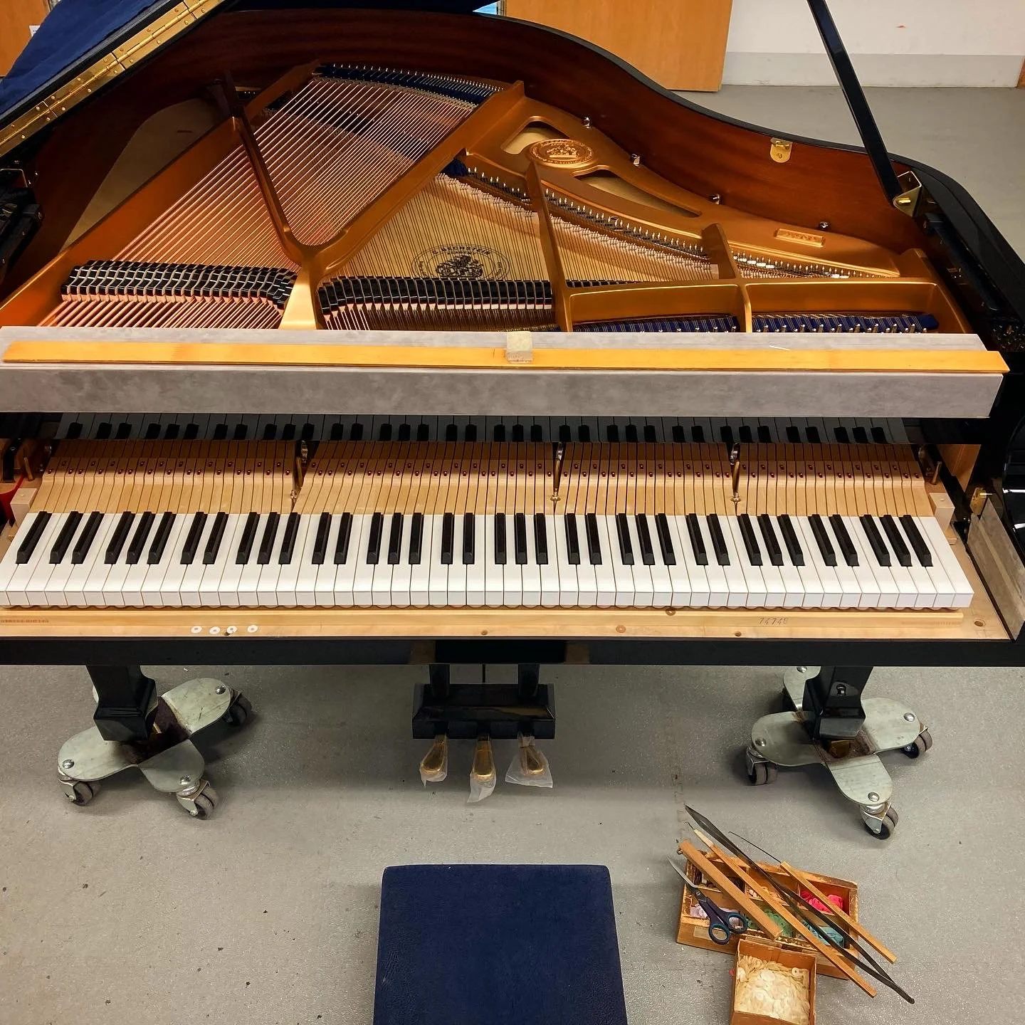 An upright piano tuning and repair service, with tools laid out and the piano open, laying bare the inside mechanical action and parts